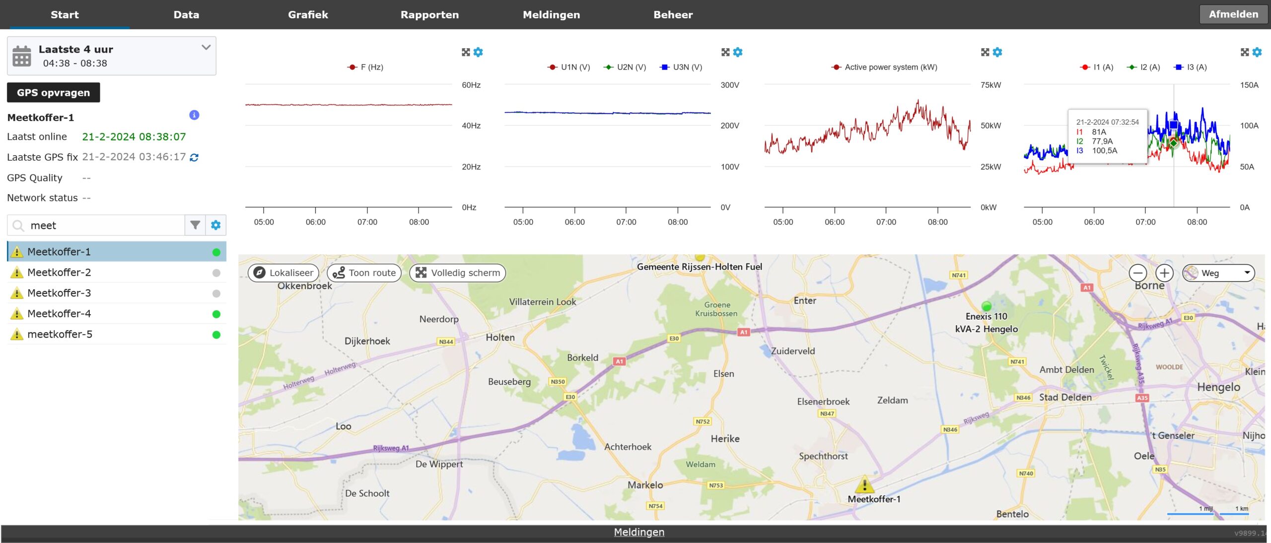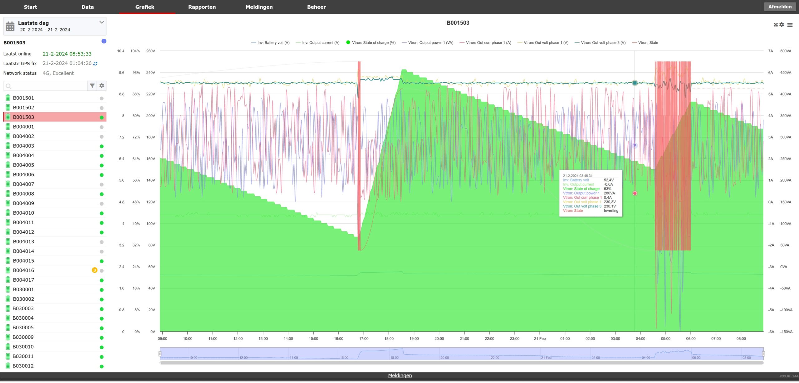 With the remote monitoring system, you can monitor mobile surveillance cameras, battery packs in vans or market vehicles, service vehicles, or other (mobile) installations from a distance. All available information from battery packs, solar panels, fuel cells, generator sets, or measurements from, for example, an energy meter, is transmitted wirelessly. The system is based on reading an energy meter or other sensors. The complete data register is read, including all information about statuses and alarms, and—if available—the event log and alarm list. This information is transmitted wirelessly or via a wired connection. You decide which information you want to see and how it should be displayed on the dashboard. You can also create your own reports.